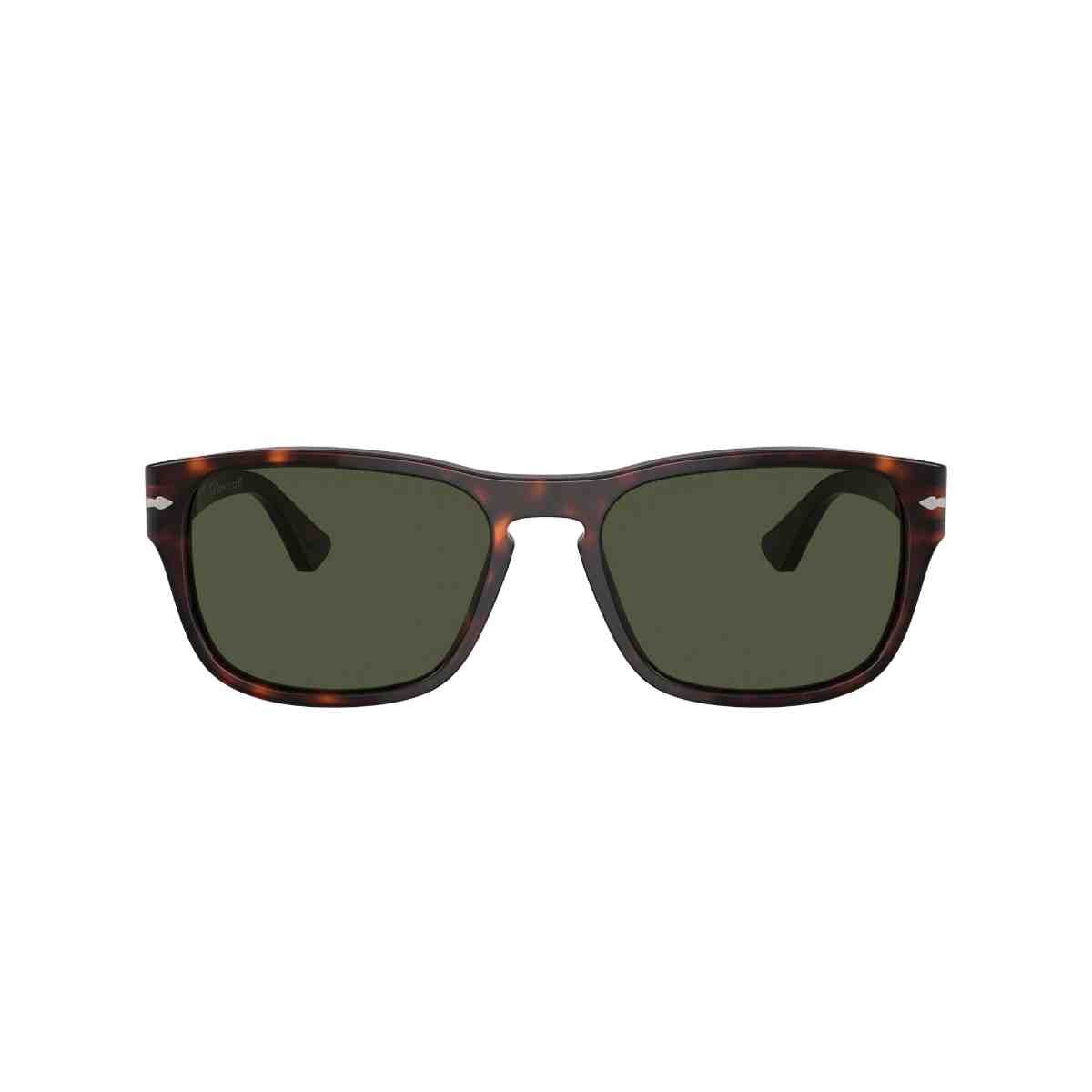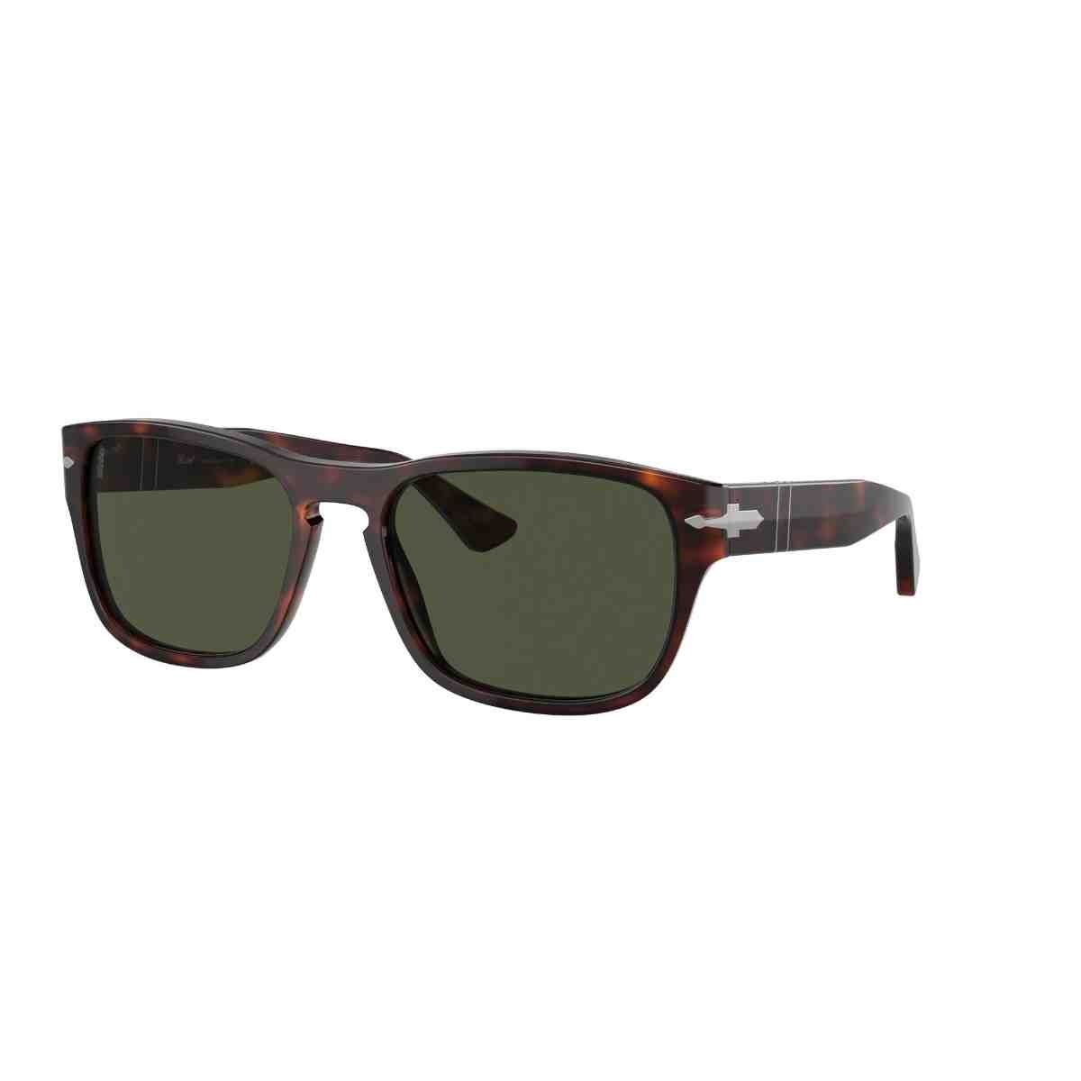 Κλασικά γυαλιά ηλίου Persol με τετράγωνο καφέ κοκάλινο σκελετό και πράσινους φακούς UV. Προσφέρουν άνεση, υψηλή προστασία και διαχρονικό στιλ για καθημερινή χρήση.