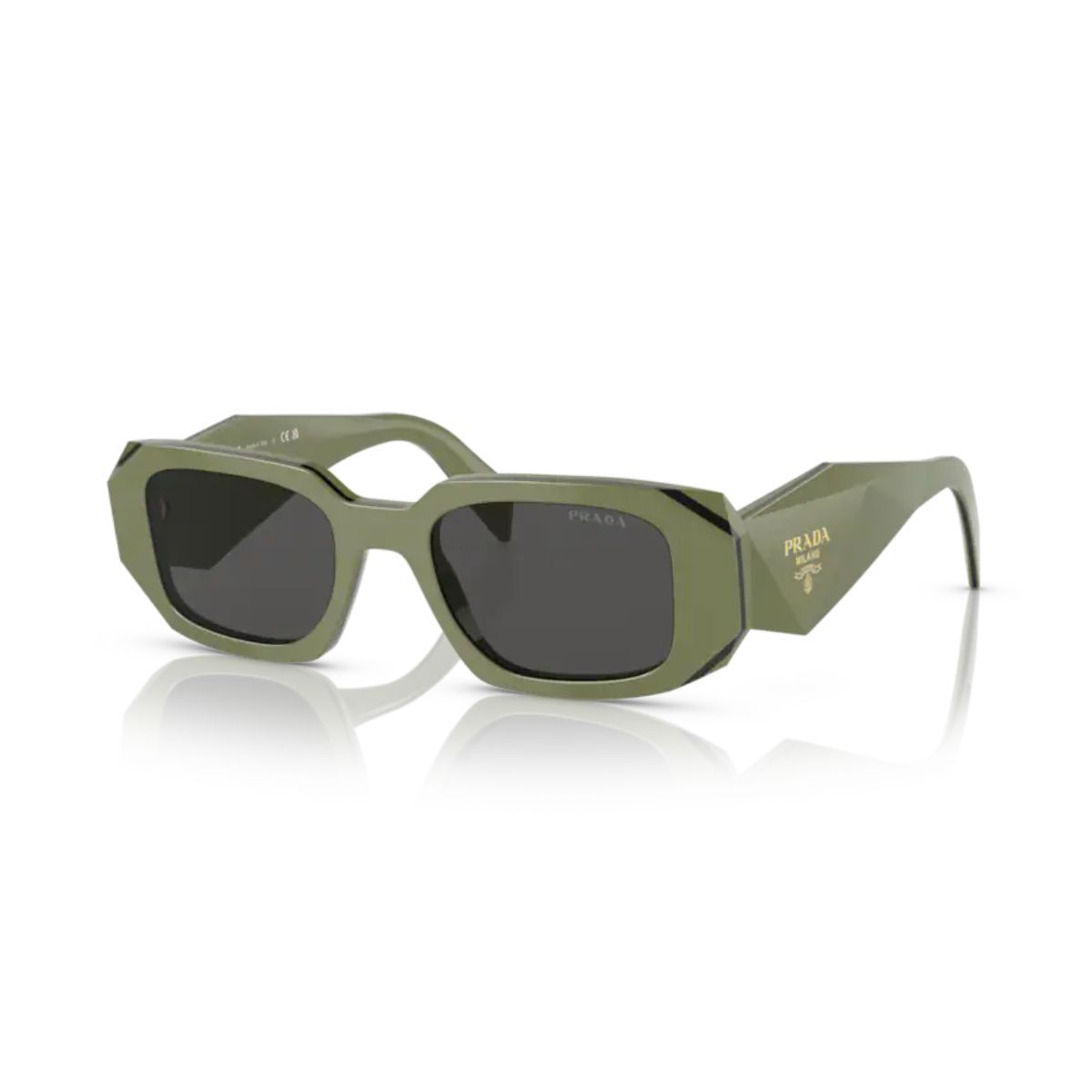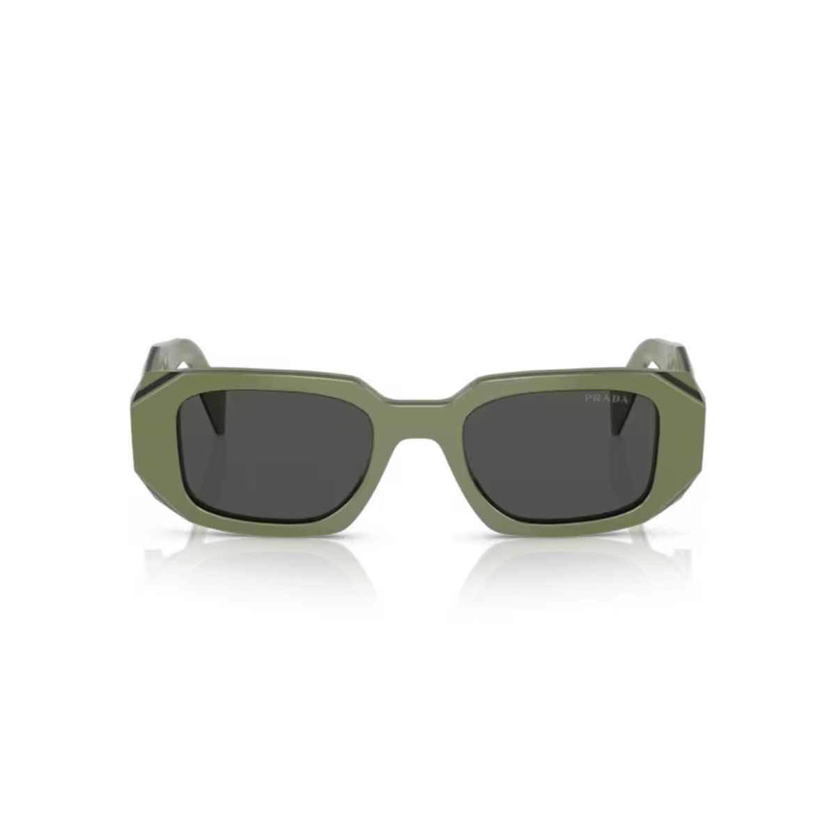Σύγχρονα γυαλιά ηλίου Prada με ορθογώνιο κοκάλινο σκελετό σε πράσινο/λαδί και φακούς υψηλής UV προστασίας. Κομψή σχεδίαση για άνεση και μοντέρνο καθημερινό στιλ.