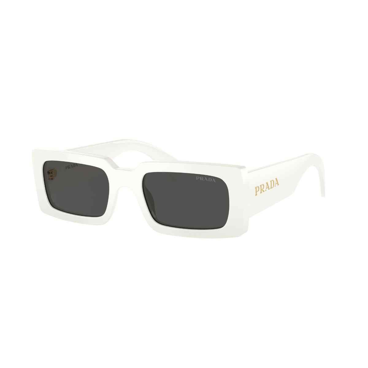 Μοντέρνα γυαλιά ηλίου Prada με ορθογώνιο κοκάλινο σκελετό σε άσπρο χρώμα και φακούς υψηλής προστασίας UV. Κομψός σχεδιασμός για δυναμικό, καθημερινό στιλ.